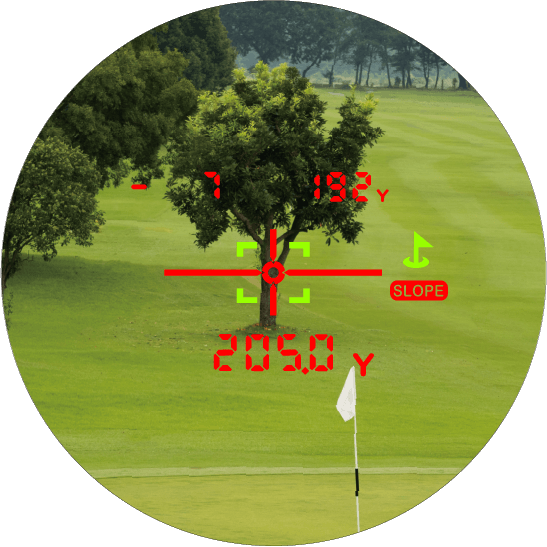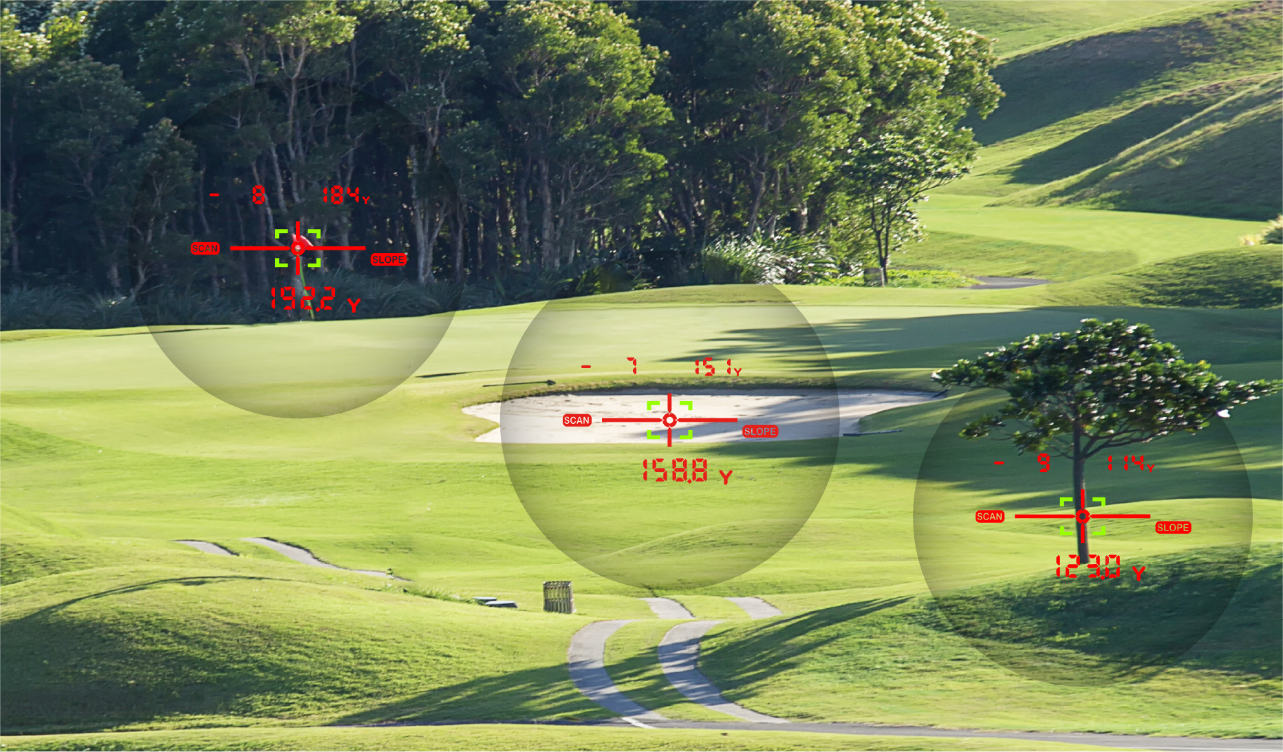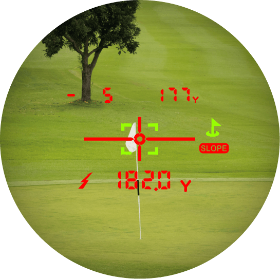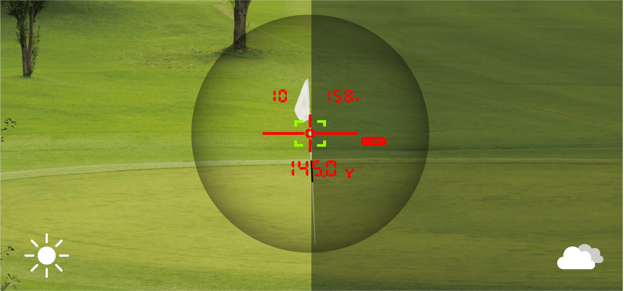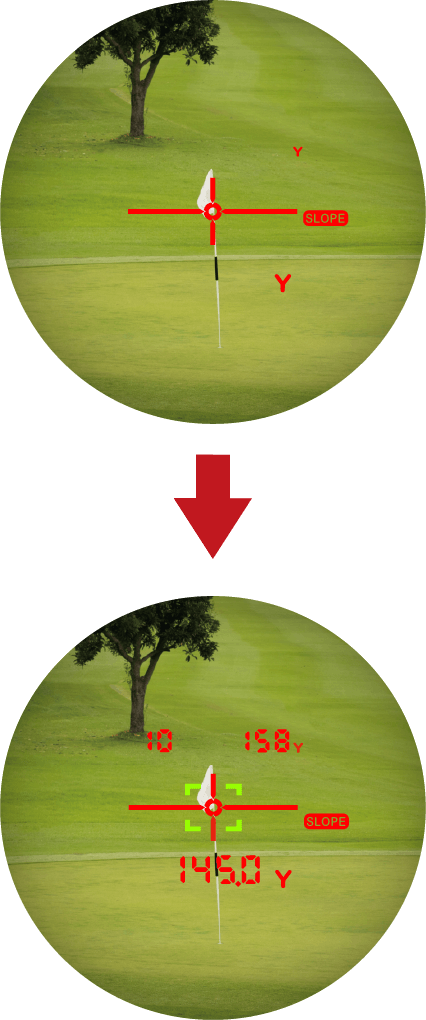 まずピンの奥にある対象物(木など)を計測します。暫定の距離が表示されたら、ピンフラッグが照準の中心になるようにゆっくり動かします