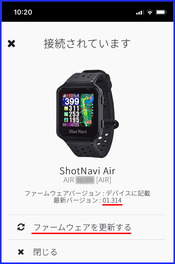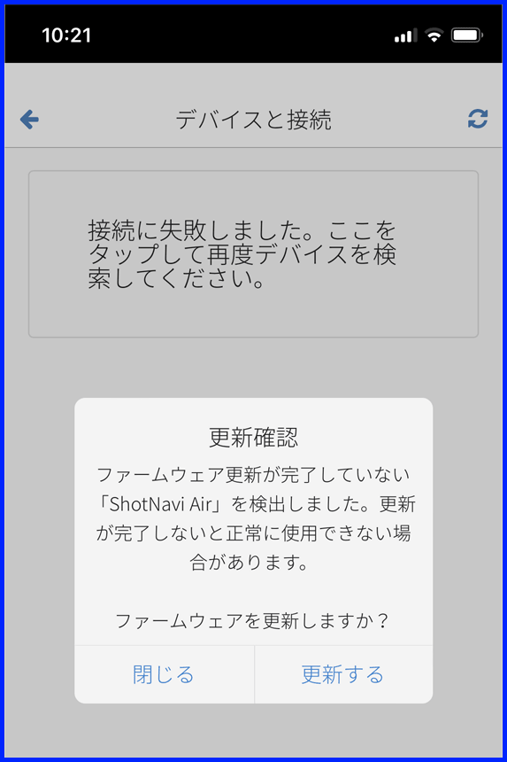更新中に中断してしまった場合、アプリとの再接続で復帰できる可能性があります。 アプリの方で「デバイスと接続」を選択してください。