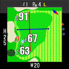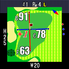 ピンポジションデータが存在すると、グリーンセンターまでの表示(C)がピンポジションまでの表示(P)になり、旗の色が水色になります。