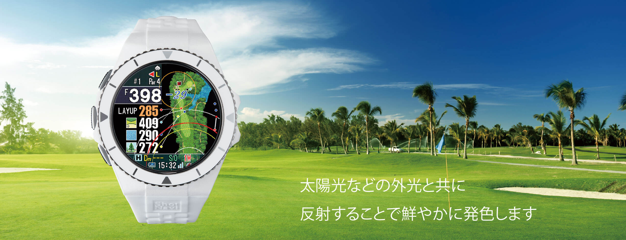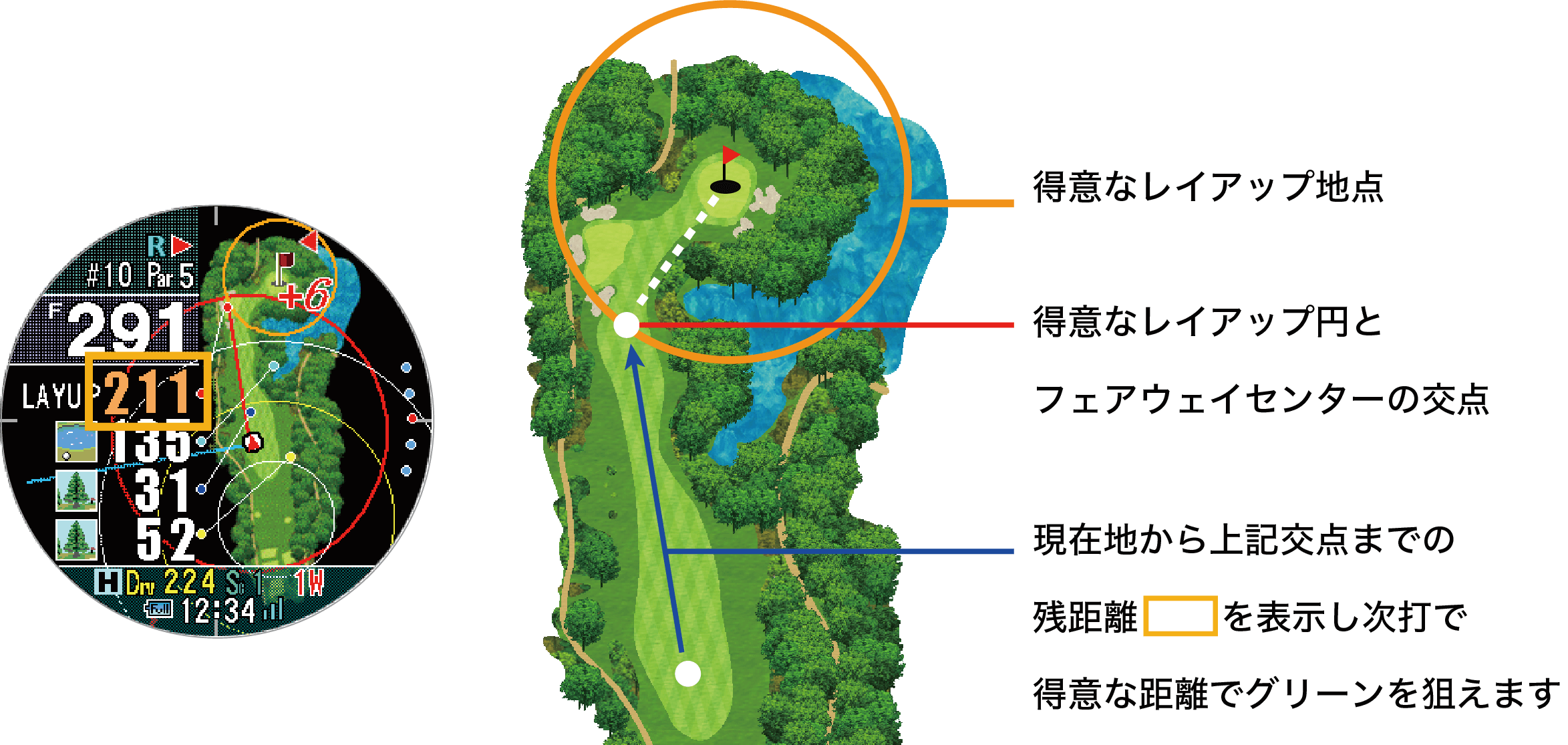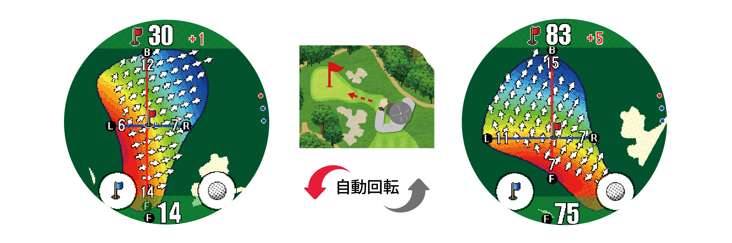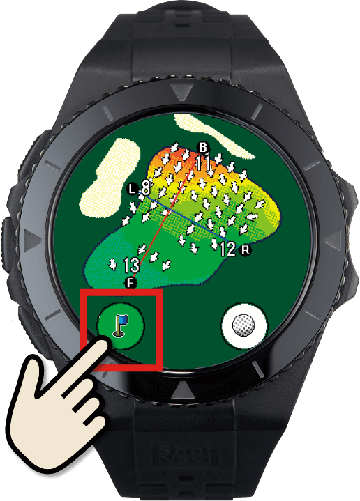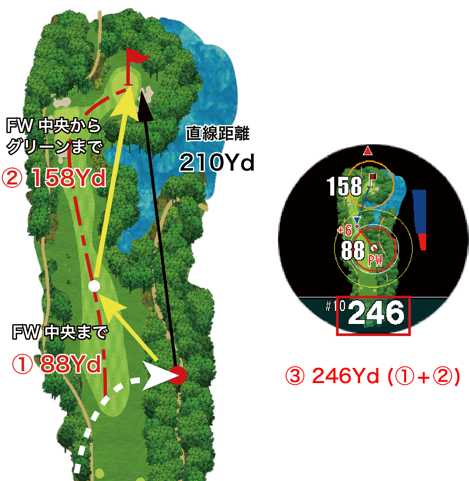 は現在地からグリーンまでの直線距離ではなく、①・②を足した実際に必要な距離が表示されます