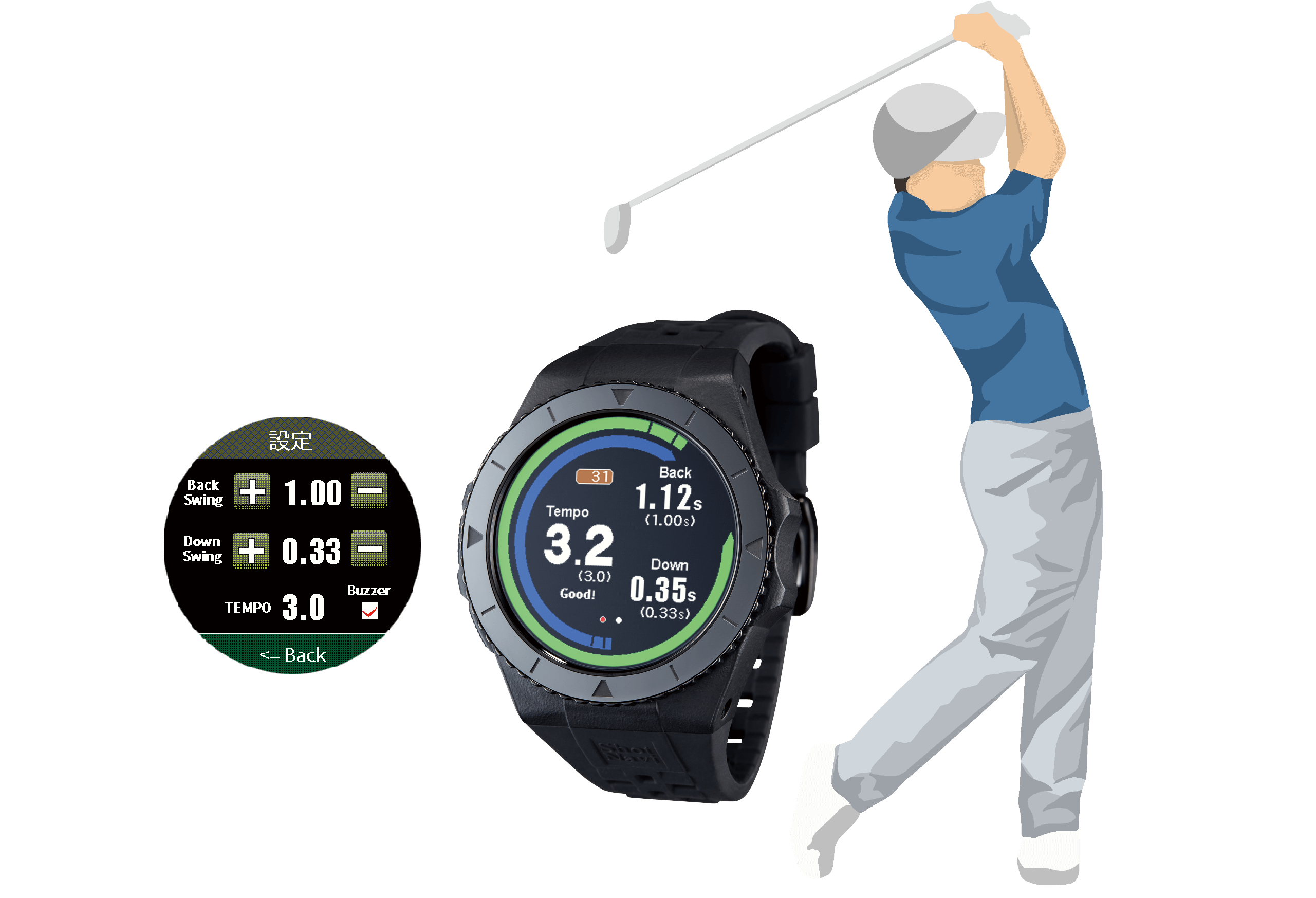 ショットの精度向上に不可欠なスイングテンポを計測可能にしました 屋外や練習場でのショットを計測し、設定したスイングに近づけば画面を緑で表し、 赤や青の表示はスイングテンポの改善ポイントを示します
