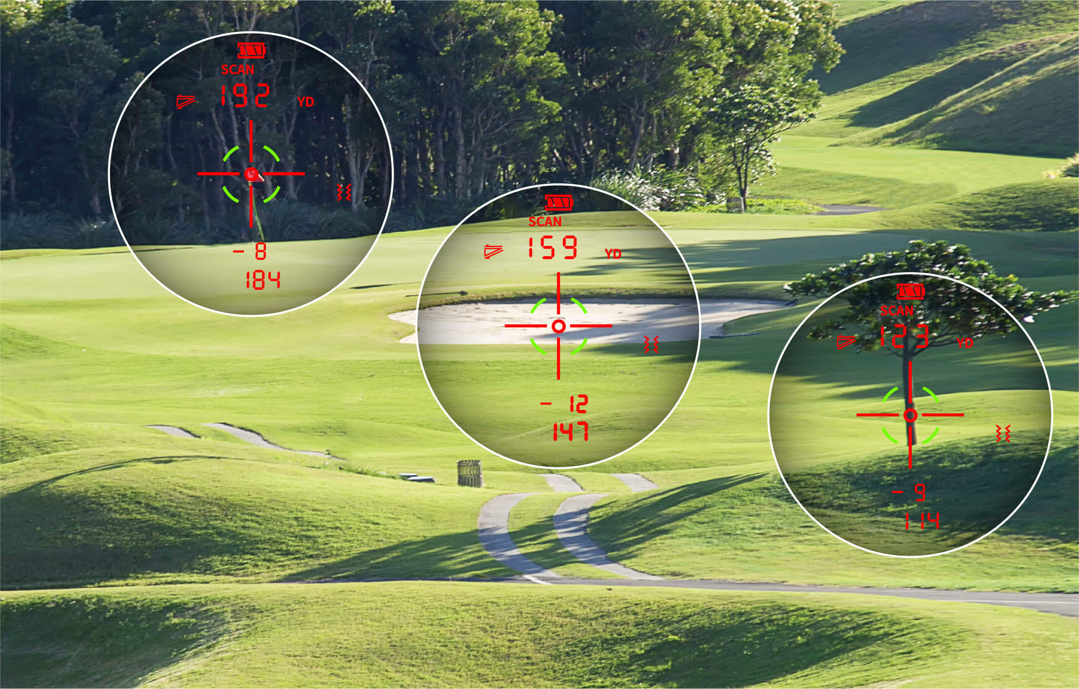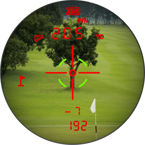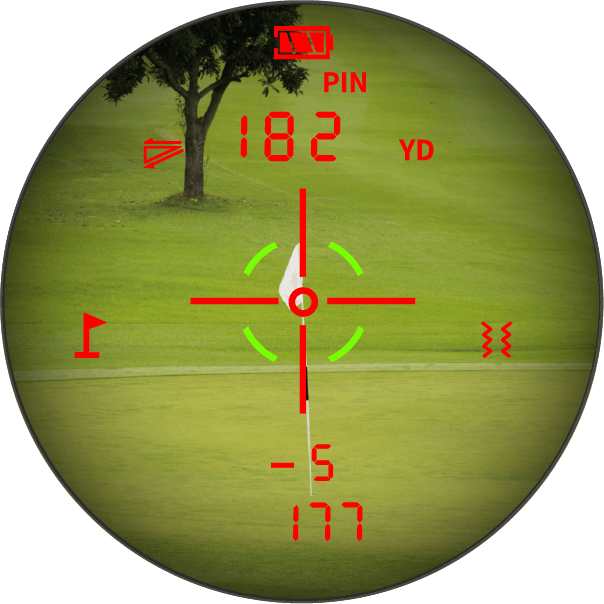 まずピンの奥にある対象物(木など)を計測します。 暫定の距離が表示されたら、ピンフラッグが照準の 中心になるようにゆっくり動かします