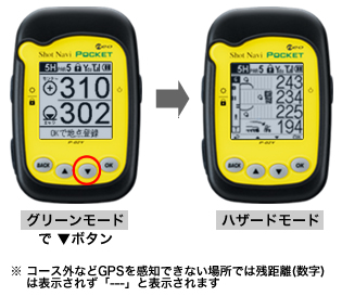 設定 → OK → ゴルフナビ → ナビ開始モード → オールモード または ハザードモード オールモード シンプルモード、グリーンモード、ハザードモードを 切替(▼)で表示する事が可能 ハザードモード ハザードモードの固定表示(他のモードは表示されません) (注) 表示方法の変更を行なわないと、ハザード情報は表示されません