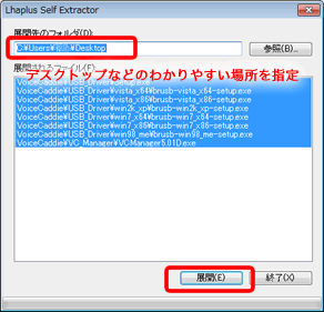 実行をクリックするとファイルの解凍保存先を聞かれますので、デスクトップなどのファイルの