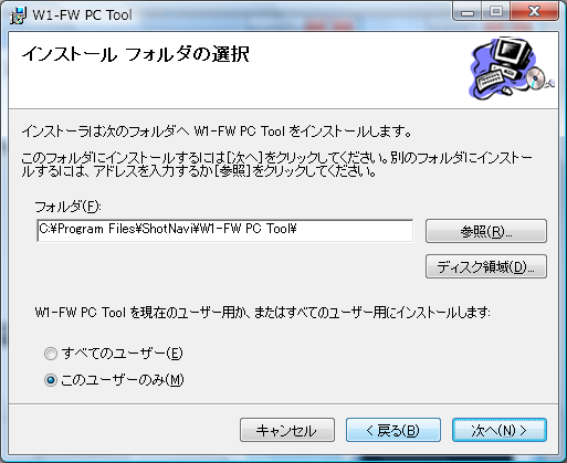 続いて Shot Navi W1-FW PC Toolのインストールが開始されます。画面に従い、インストールを完了してください。