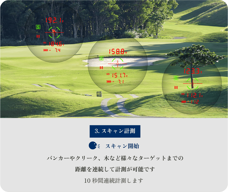 バンカーやクリーク、木など 様々なターゲットまでの距離を一度に知りたい際に役立つ機能