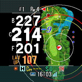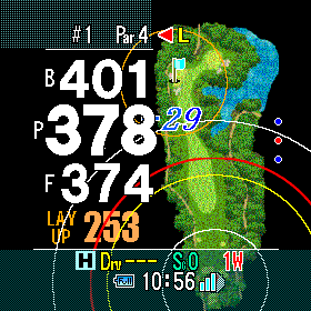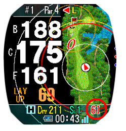 ピンポジションデータが存在すると、グリーンセンターまでの表示(C)がピンポジションまでの表示(P)になり、旗の色が水色になります。