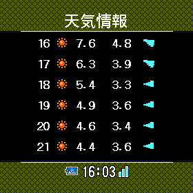 左から、時刻、天気、気温、風速、風向(上が北)の表示となります。