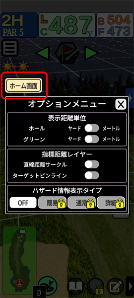 ナビ画面の表示はホームメニューの「ゴルフ場検索」からゴルフ場を選択し、ラウンド設定で「開始」を押します。