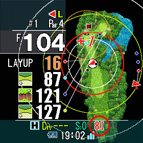 ピンポジションデータが存在すると、グリーンセンターまでの表示(C)がピンポジションまでの表示(P)になり、旗の色が水色になります。