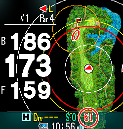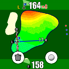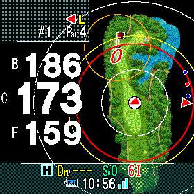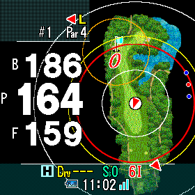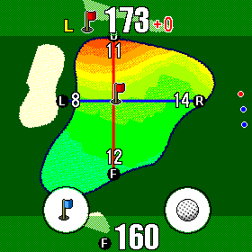 ピンポジションデータが存在すると、グリーンセンターまでの表示(C)がピンポジションまでの表示(P)になり、旗の色が水色になります。