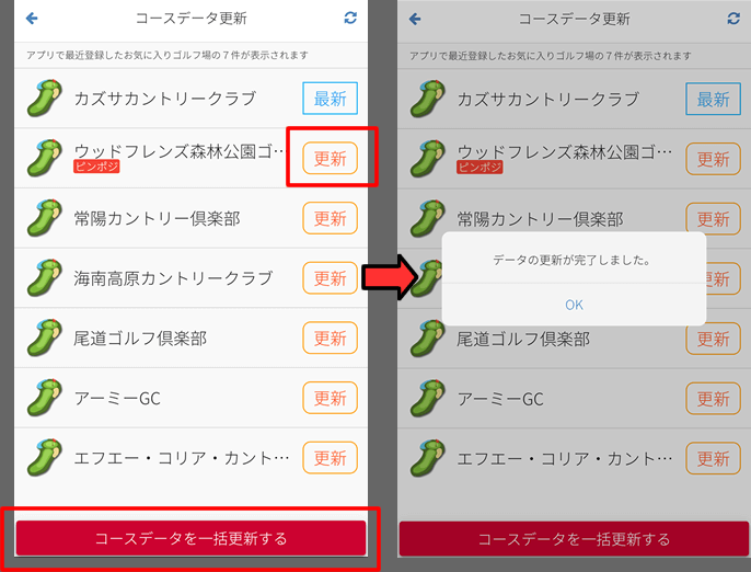 アプリで最近登録したお気に入りゴルフ場7件が表示され、デバイスのゴルフ場データが最新か どうかチェックを行います。