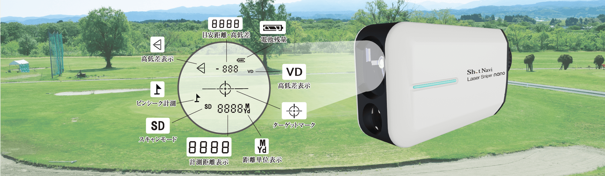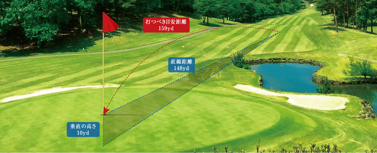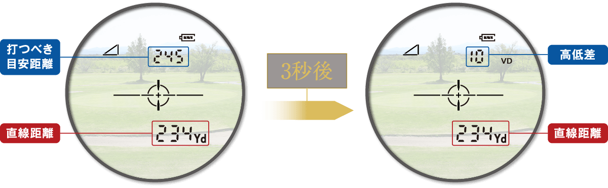 高低差のあるショットの場合、計測された直線距離に加え、 打上げ、打下し時において、高低差情報を加味した実際に打つべき目安距離を自動で計算し表示します。