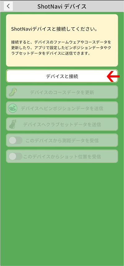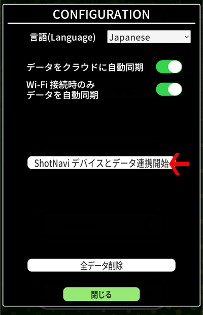 アプリの設定画面で、「ShotNaviデバイスとデータ連携開始」を押します。