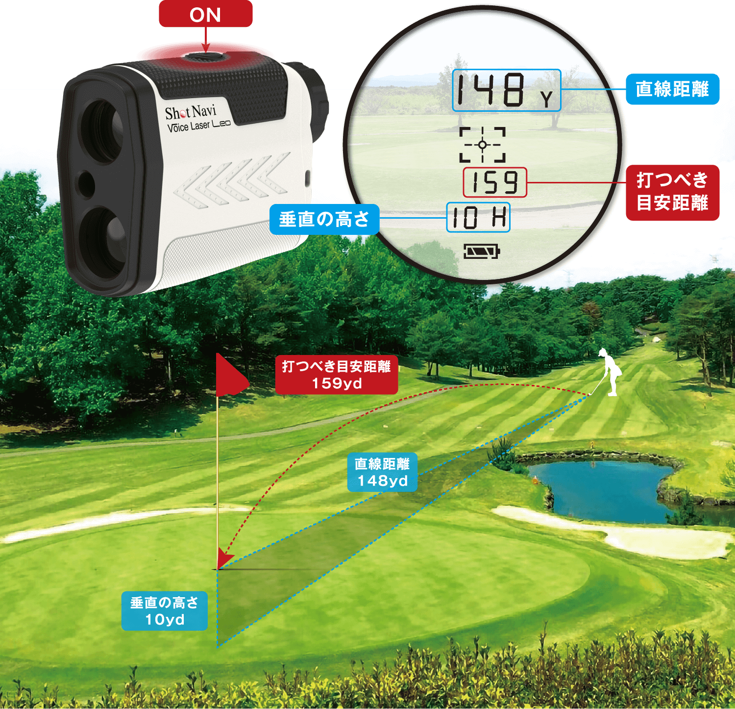 打上げ、打下し時において、高低差情報を加味した実際に打つべき目安距離を自動で計算し表示します。
