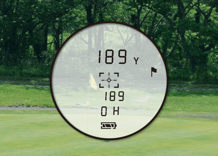 ②距離が表示されたら照準をゆっくりとピンフラッグの方へ振る。ピンを認識すると振動しピンフラッグまでの距離を表示。