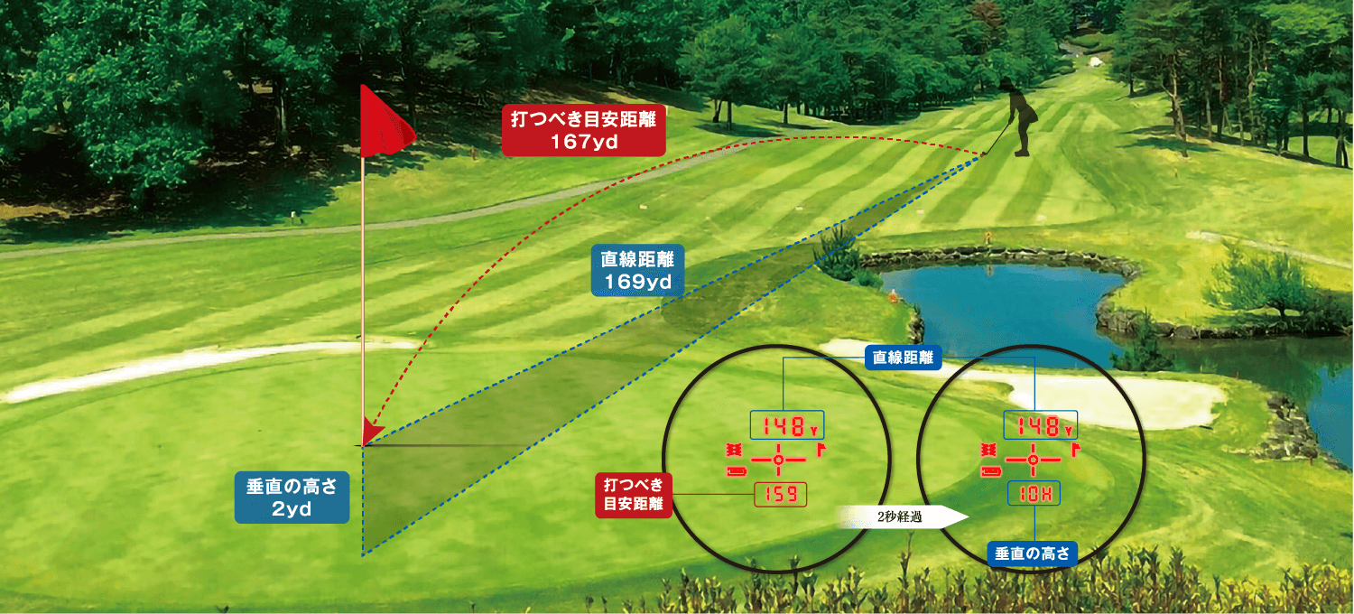 打上げ、打下し時において、高低差情報を加味した実際に打つべき目安距離を自動で計算し表示します。