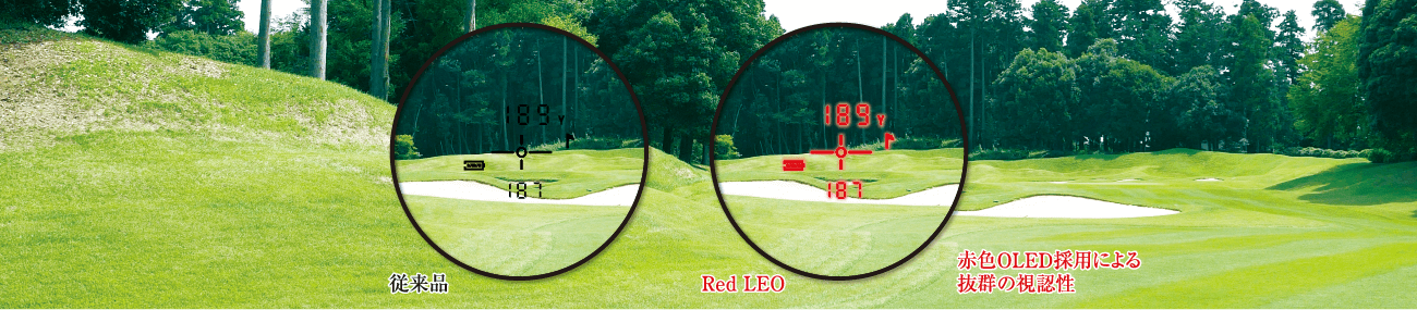赤色表示によりゴルフ場などの緑が多いシーンで従来の黒色表示と比べて快適に距離計測結果を確認できます。